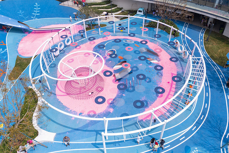 這是一款以 “月亮與星空” 為設(shè)計(jì)靈感的沉浸式戶外游樂設(shè)施,整體采用夢幻藍(lán)粉漸變配色,地面印著錯(cuò)落的星空圓環(huán)圖案,營造出浪漫的宇宙氛圍。