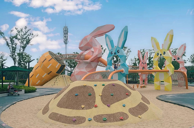 設備集多元游樂體驗于一體:巨型胡蘿卜滑梯帶來俯沖滑行的刺激,攀巖沙坡鍛煉肢體力量,兔子造型的鉆爬網(wǎng)與連廊則滿足孩子們的探索欲與社交需求。它不僅能讓孩子在萌趣的童話場景中釋放活力,還憑借超高顏值成為親子家庭的拍照打卡點,適合安置在親子樂園、城市公園及文旅營地等場景。
