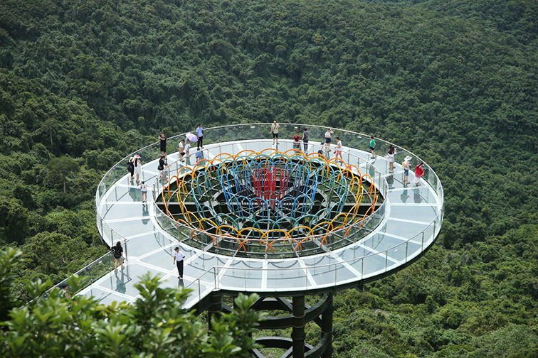 這是一款依托熱帶雨林地貌打造的高空玻璃觀景平臺(tái),以圓形全透明玻璃為主體,中心鑲嵌彩色交織的藝術(shù)裝置,造型如一顆懸浮于林海之上的璀璨眼眸,視覺上極具現(xiàn)代藝術(shù)感與震撼力。