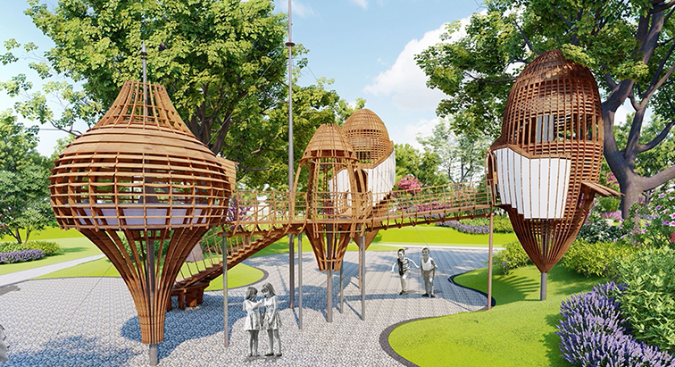 這是一組以自然編織美學(xué)為核心的戶外特色樹屋集群,采用原木材質(zhì)編織成燈籠狀與鳥巢狀的架空小屋,通過木質(zhì)棧道串聯(lián)成整體,造型如散落林間的天然巢穴,與周邊綠樹繁花高度融合,充滿野趣與童話感。