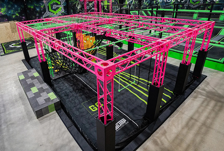 這是一款專為年輕客群與青少年打造的模塊化室內(nèi)闖關(guān)游樂設(shè)備,以高飽和粉綠撞色鋼架為核心框架,融合繩網(wǎng)攀爬、懸掛橫桿、鏈條穿越等多元挑戰(zhàn)模塊,下方鋪設(shè)高密度緩沖墊,整體如一座充滿潮流感的像素風(fēng)戰(zhàn)陣,兼具視覺沖擊力與競(jìng)技樂趣。