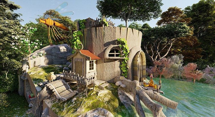 這是一款以巨型樹樁為原型的童話主題景觀設(shè)備,仿天然樹樁紋理的主建筑搭配迷你木屋、爬藤綠植與巨型昆蟲雕塑,周邊環(huán)繞樹林與水域,整體造型如藏于林間的奇幻秘境,充滿童話感與野趣。