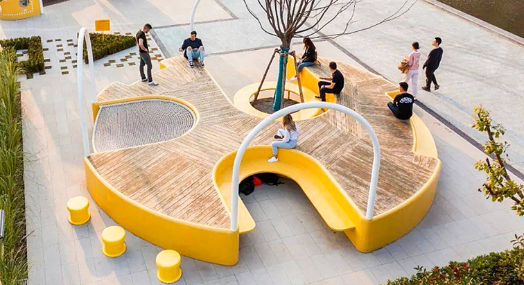 這是一款兼具休憩、社交與輕互動(dòng)功能的公共景觀裝置,以流暢的曲線造型為核心,黃色玻璃鋼底座搭配木質(zhì)防滑面板,圍繞中心樹池打造出多層次的坐臥空間,還融入了迷你滑梯模塊,視覺(jué)上充滿活力與現(xiàn)代感。