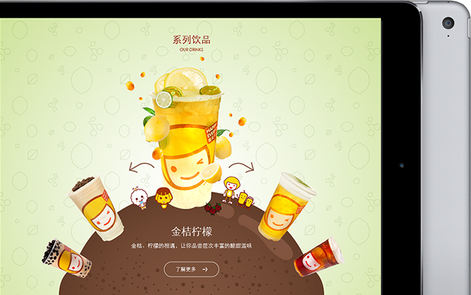 首頁的產(chǎn)品信息(飲品),邁若設計出創(chuàng)意十足的新穎的展示方式——檸檬星球,讓網(wǎng)頁的交互動畫變得更加生動有趣。融入背景及底紋等豐富元素來展現(xiàn)每個產(chǎn)品(飲品),獨特的瀏覽體驗在第一時間吸引瀏覽者的目光,讓人眼前一亮,彰顯獨特,增加交互。