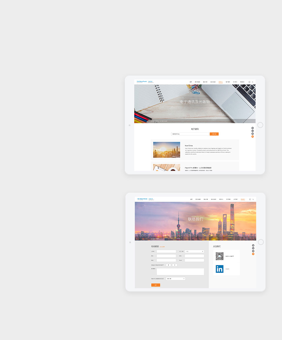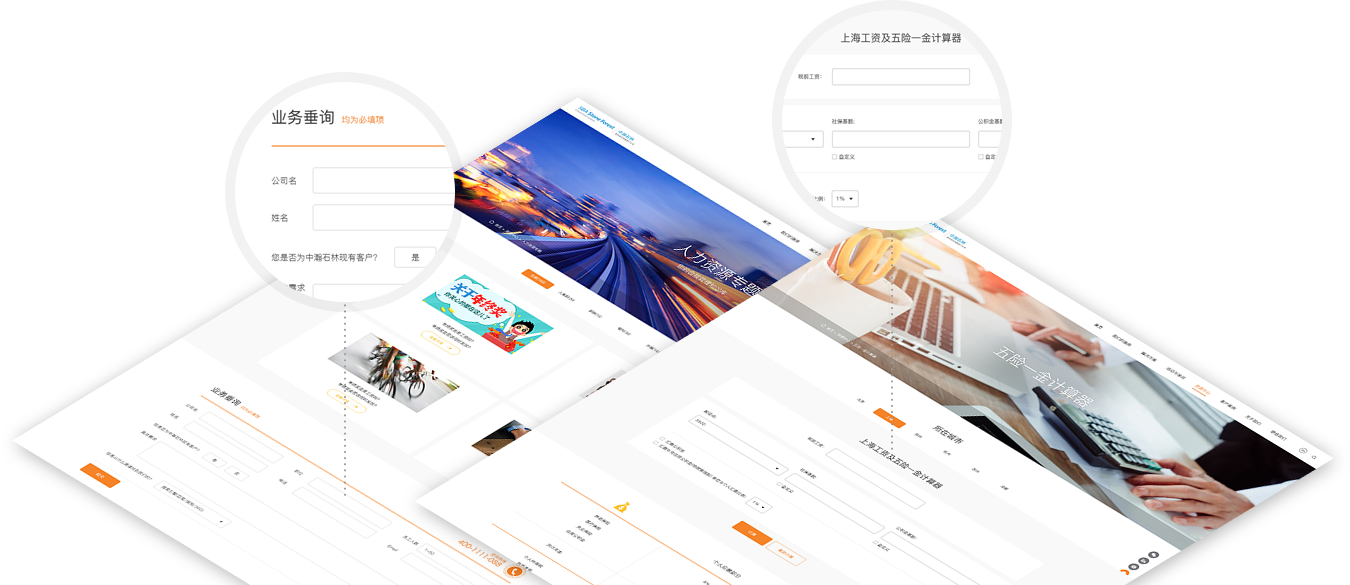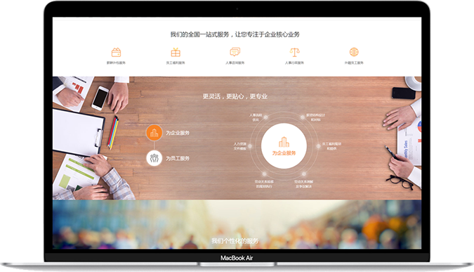 首頁中將業務分成“為企業服務”和“為員I服務”兩大類,利用流動的線條將六大核心服務項目串聯起來,融合頁面滾動式加載效果,給用戶帶來全新的瀏覽體驗。