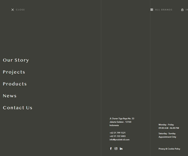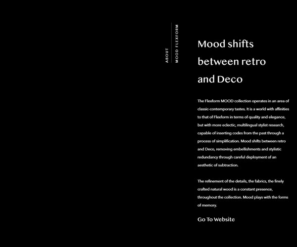 Prodotti提供精美的家具,官網的建設通過黑底和暖色產品圖形成對比加強視覺效果,