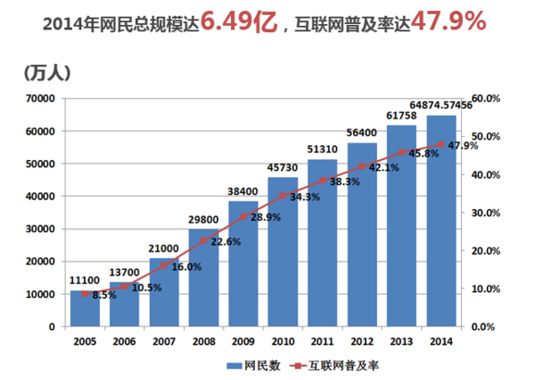 1、據相關數據統計,截至2014年12月,我國網民規模達6.49億,互聯網普及率為47.9%(如下圖)。龐大的網民數量,你還擔心企業沒有客戶么。