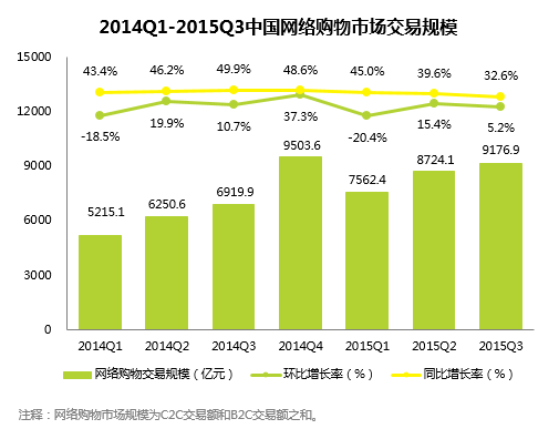 2、據相關最新數據顯示:2015Q3中國網絡購物市場交易規模達9176.9億元(如下圖),同比增長32.6%;根據國家統計局發布的數據顯示,2015Q3我國社會消費品零售總額達到7.5萬億元,網絡購物在社會消費品零售總額中的占比為12.3%,單季度滲透率繼續攀升。如此網絡交易增速,您還有什么理由不做網站呢。