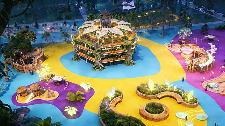 這是一款沉浸式奇幻風(fēng)格室外拓展游樂(lè)設(shè)備,以熒光森林秘境為設(shè)計(jì)靈感,打造出多層錯(cuò)落的樹(shù)屋平臺(tái)、蜿蜒棧道與發(fā)光互動(dòng)裝置,搭配大面積彩色地面與仿真綠植,營(yíng)造出夢(mèng)幻的夜間探險(xiǎn)氛圍。主體采用環(huán)保防腐實(shí)木搭建樹(shù)屋與棧道,搭配高強(qiáng)度鋼材框架與 LED 燈光系統(tǒng),既保障了結(jié)構(gòu)穩(wěn)固與游玩安全,又通過(guò)鮮明色彩與發(fā)光裝置形成強(qiáng)烈視覺(jué)沖擊。設(shè)備集高空行走、親子互動(dòng)、沉浸式打卡于一體,適用于主題樂(lè)園、文旅綜合體、研學(xué)基地等場(chǎng)景,讓游客在奇幻森林中鍛煉平衡感、勇氣與探索精神,開(kāi)啟一段充滿(mǎn)驚喜的熒光探險(xiǎn)之旅。